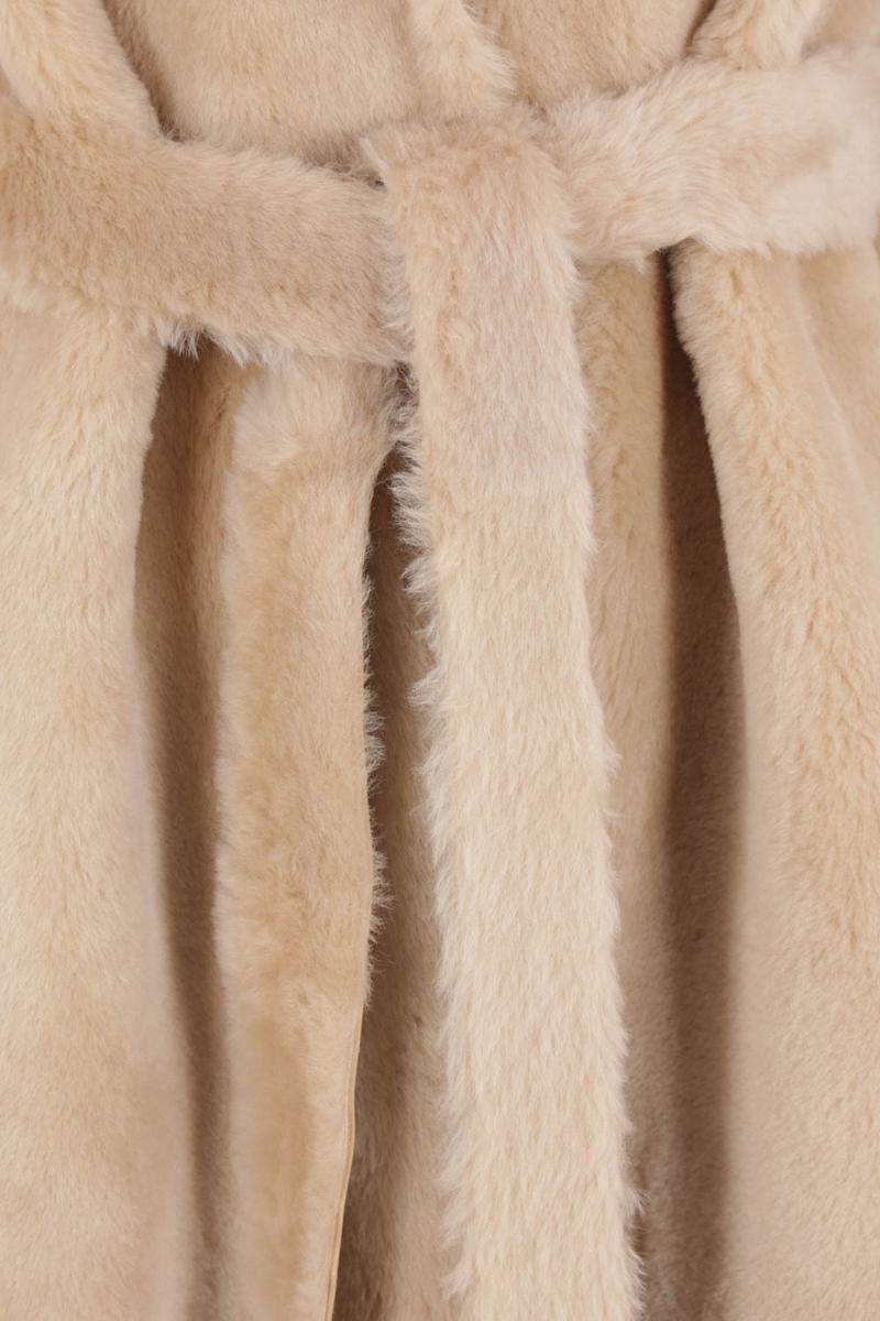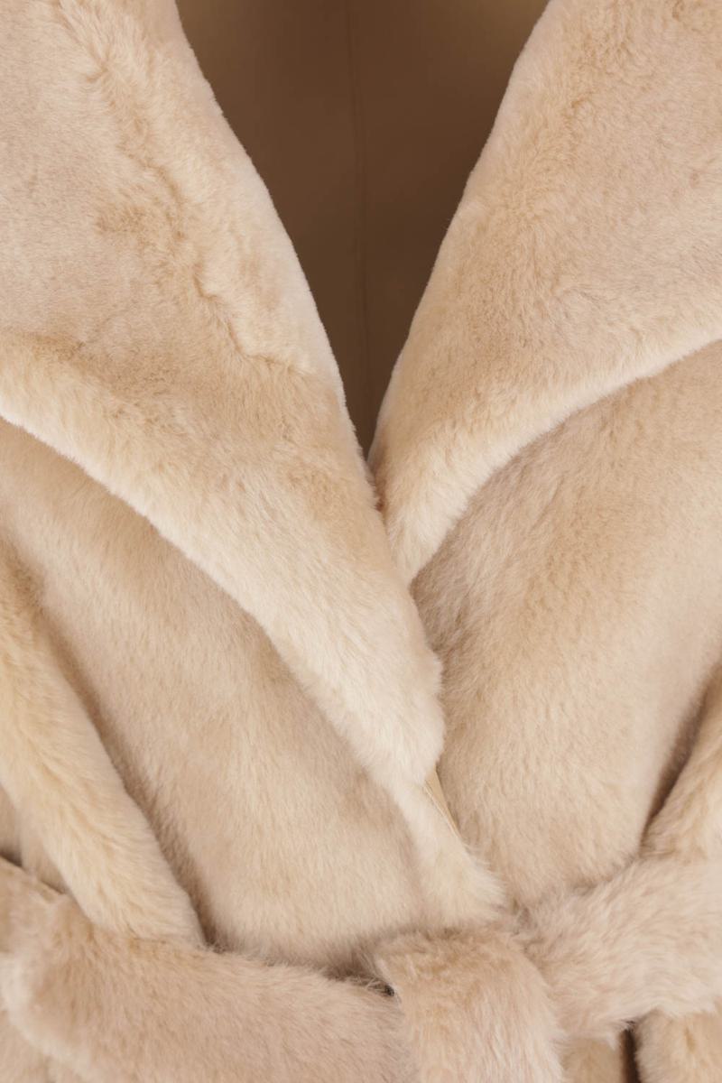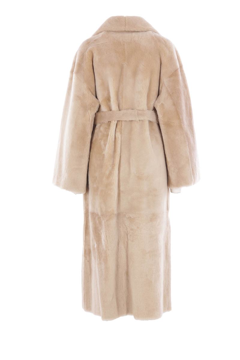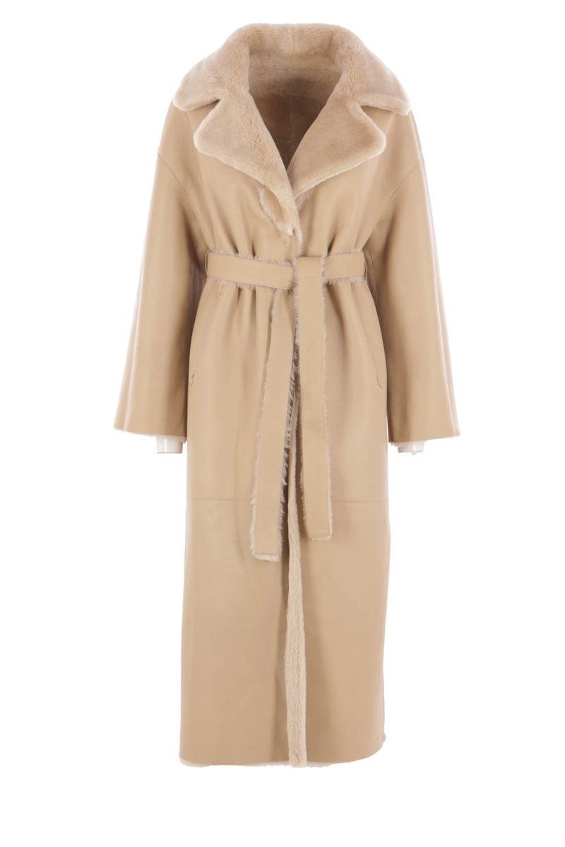 Arma Wendemantel aus beigem Shearling und Nappaleder. Mit breitem Revers, Druckknopfverschluss vorne, verdeckten Seitentaschen, langen Ärmeln und passendem Gürtel.