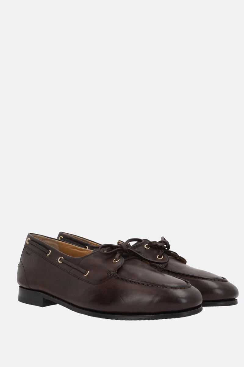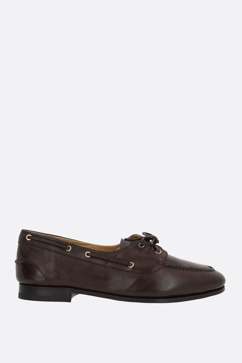 Bally-Loafer aus glattem, ebenholzfarbenem Leder mit Metallösen. Mit mandelförmiger Spitze, Schnürung, abgerundeter Spitze, Lederfutter und Leder-/Gummisohle. Abgerundet wird das Design durch den unverwechselbaren Logo-Schriftzug an der Seite.