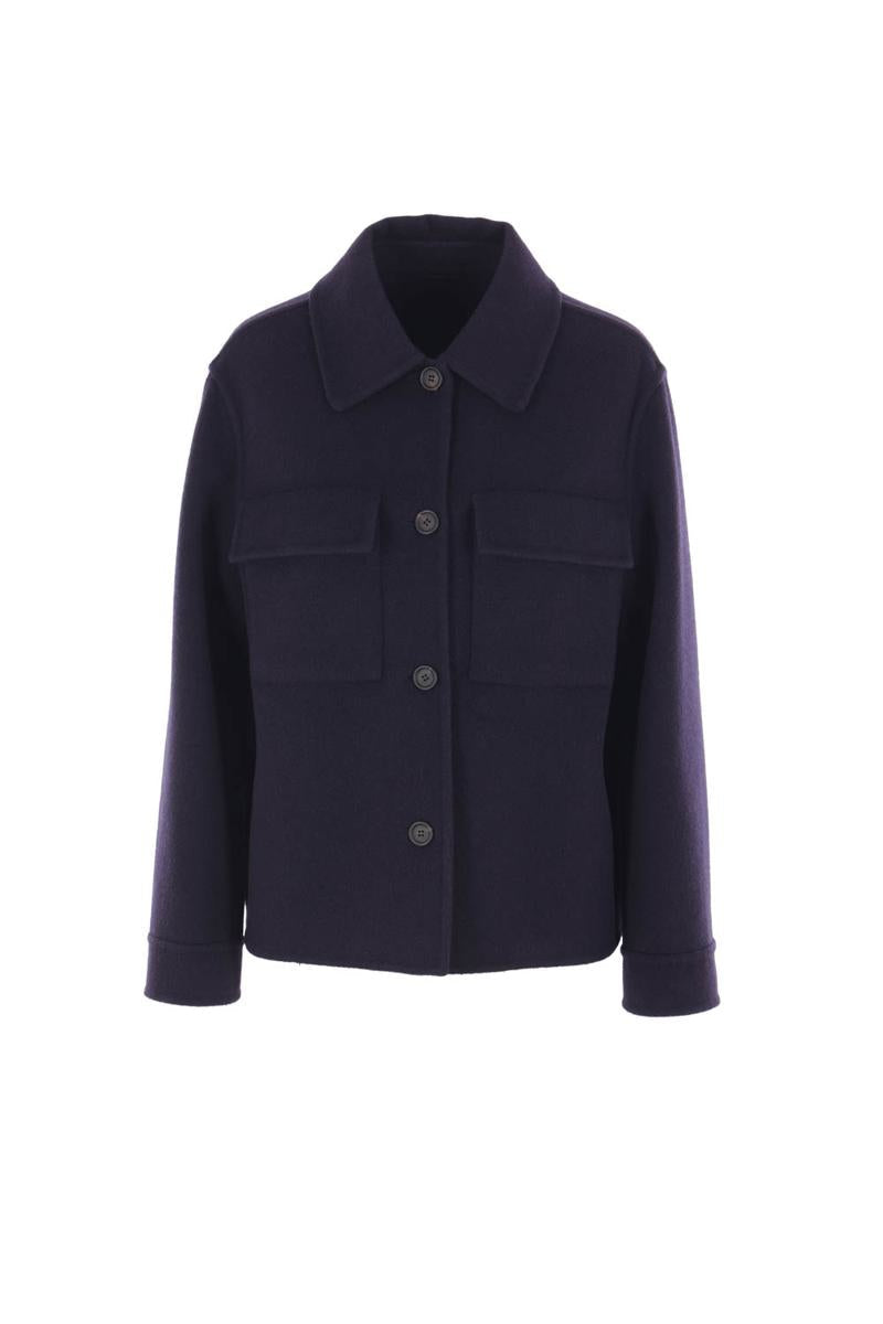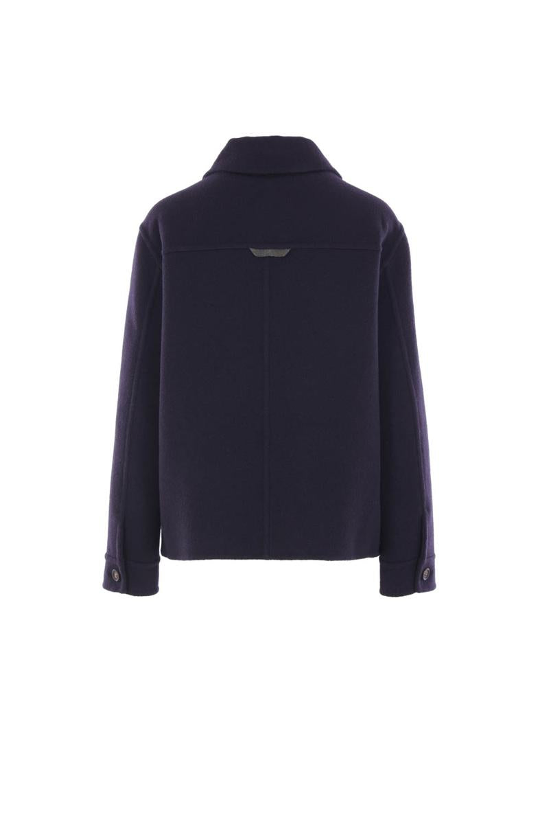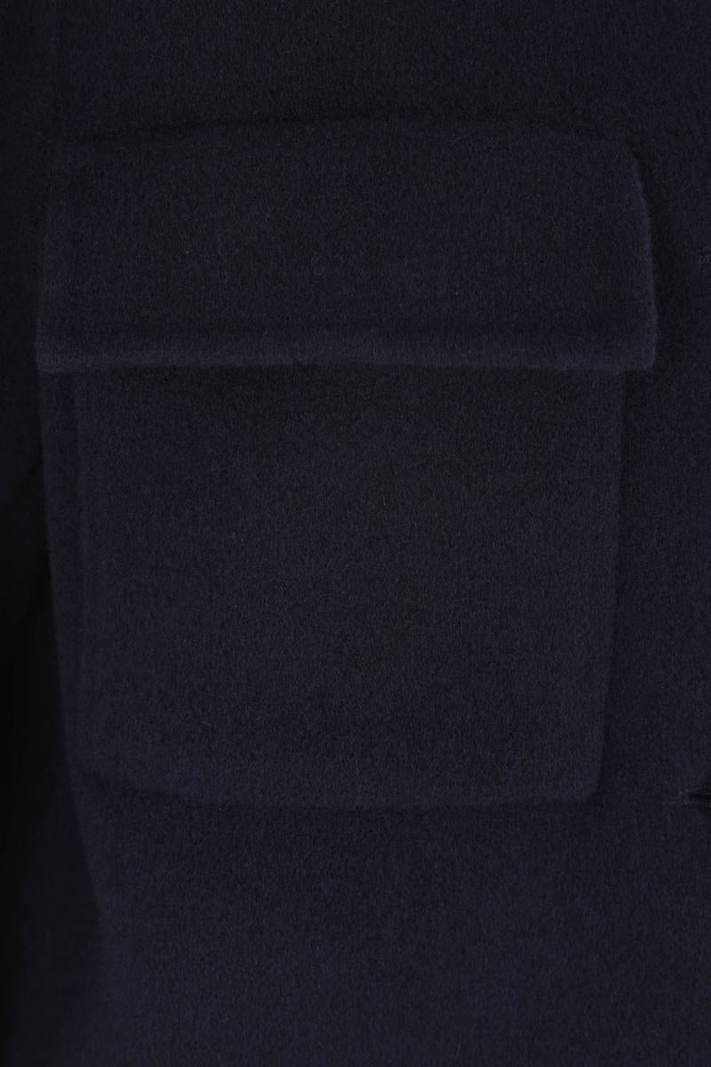 Brunello Cucinelli Overshirt aus blauem Woll- und Kaschmirstoff. Mit spitzem Kragen, Knopfverschluss vorne, Pattentaschen auf der Brust, langen Ärmeln mit geknöpften Manschetten und geradem Saum. Innen ungefüttert.