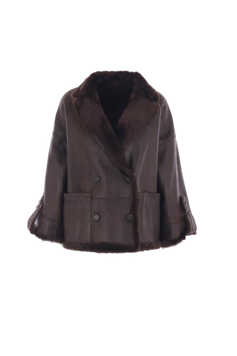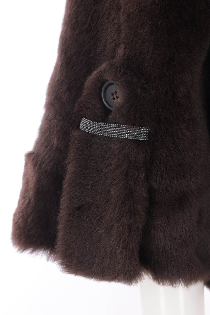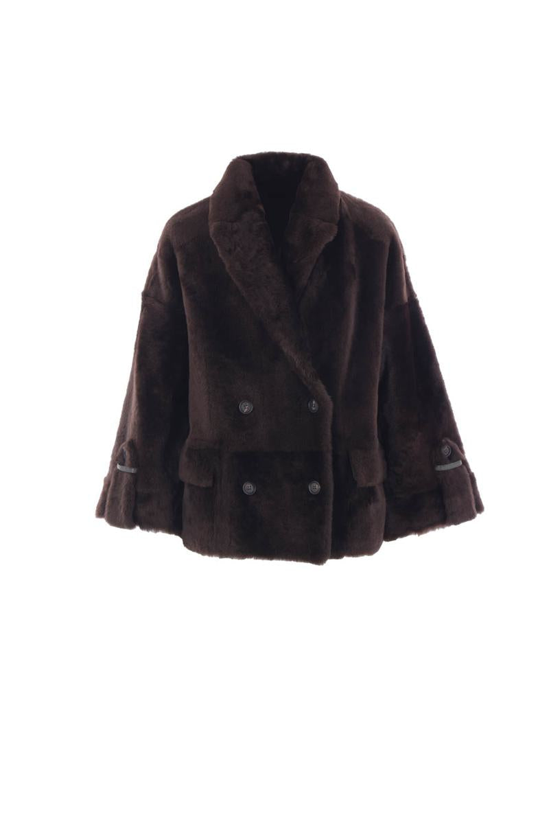 Wendbarer Cabanmantel von Brunello Cucinelli aus dunkelbraunem Lammfell. Er verfügt über ein klassisches Revers, einen zweireihigen Knopfverschluss, Vordertaschen, Dreiviertelärmel mit Monil-Details und einen geraden Saum.