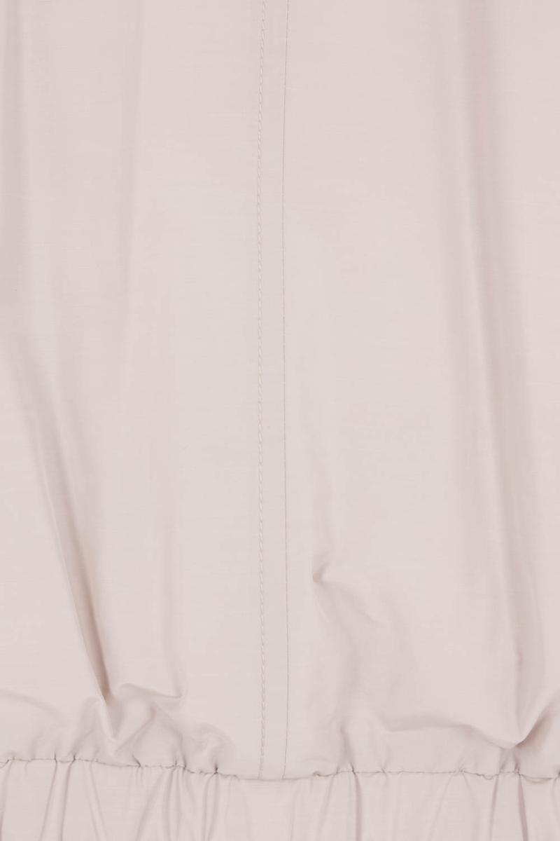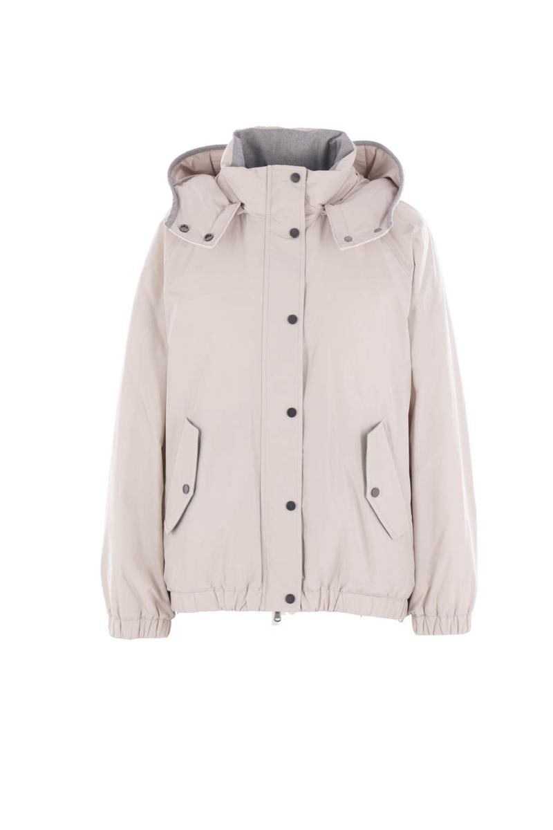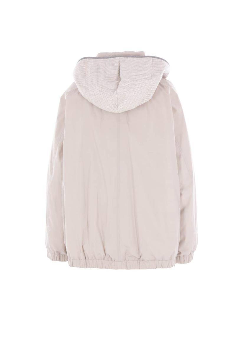 Übergroße Daunenjacke von Brunello Cucinelli aus taupegrauer technischer Baumwolle. Sie verfügt über einen hohen Kragen, eine abnehmbare Kapuze aus Rippstrick, einen Frontverschluss mit Zwei-Wege-Reißverschluss und Druckknöpfen, Pattentaschen, lange Ärmel und elastische Besätze.
