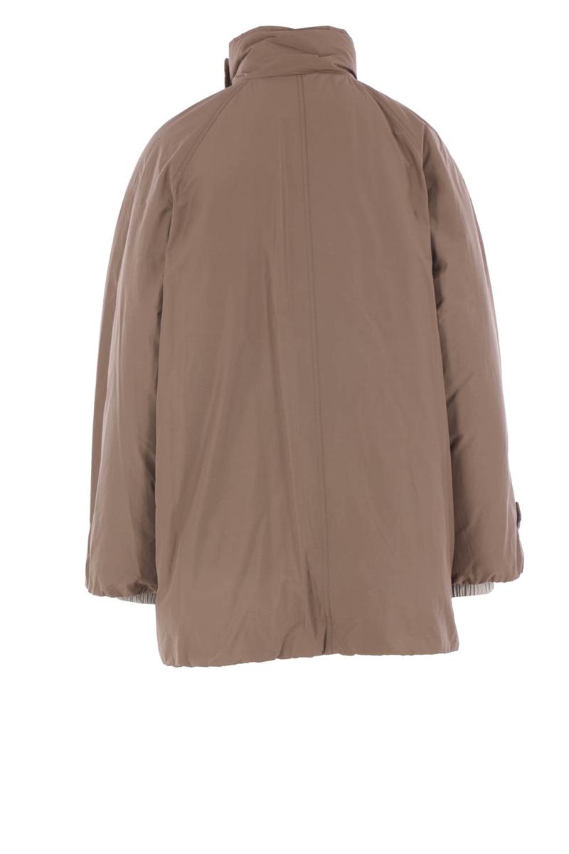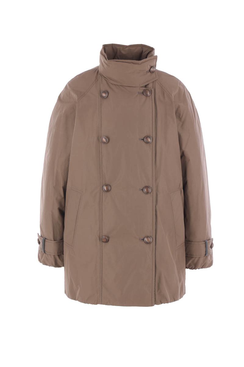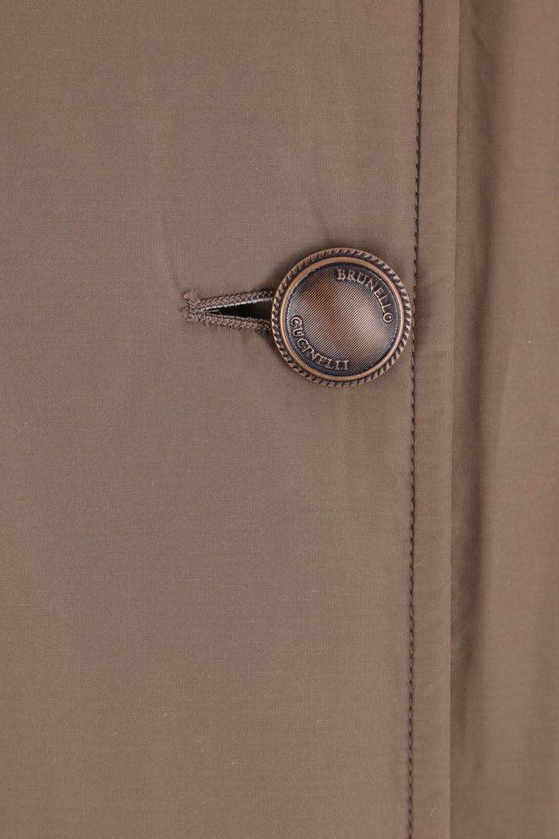 Daunenjacke von Brunello Cucinelli aus brauner technischer Baumwolle. Mit hohem Kragen, zweireihigem Verschluss mit Metallknöpfen, Leistentaschen, langen Ärmeln und geradem Saum mit Kordelzug. Abgerundet wird das Design durch Handgelenksschlaufen mit zarter, funkelnder Monili-Stickerei.