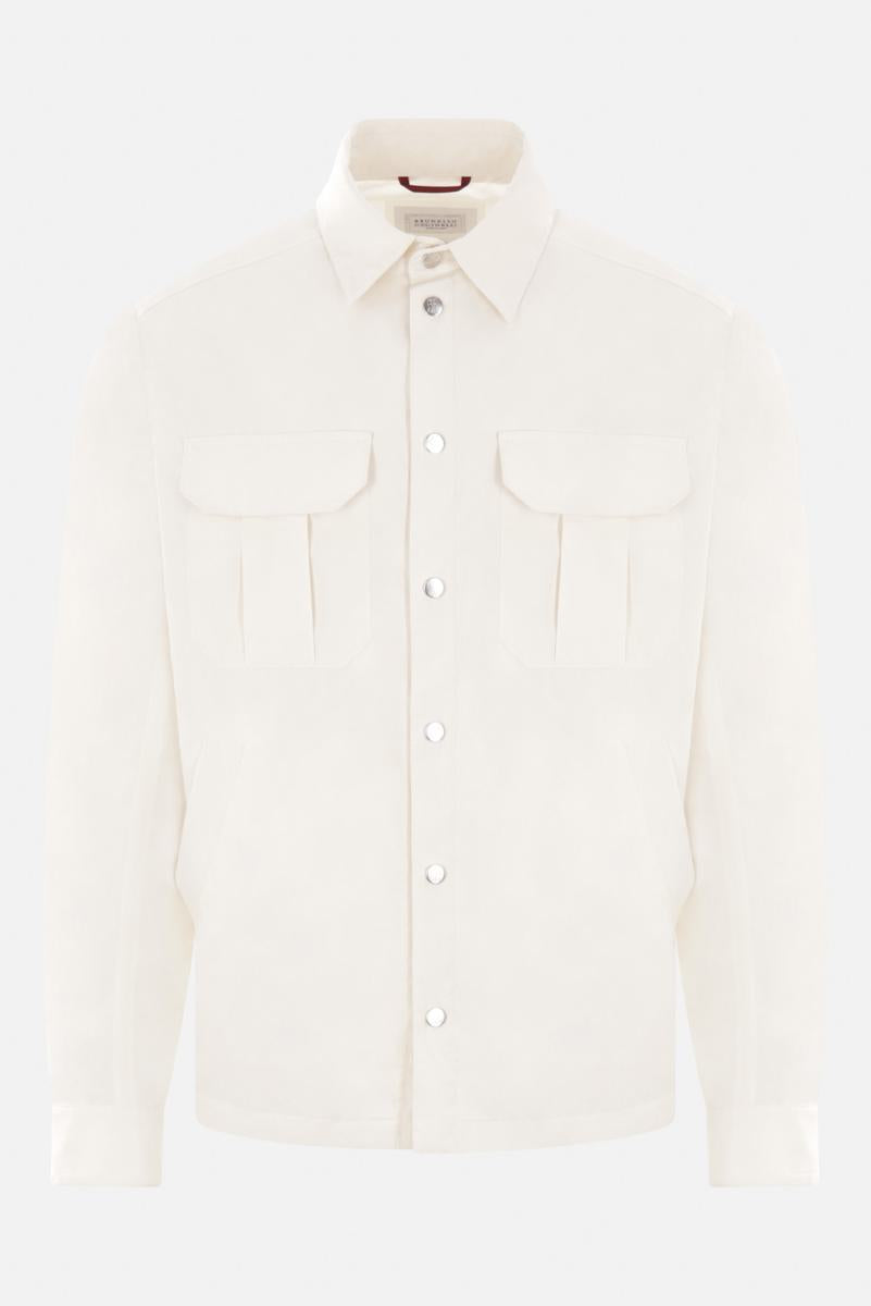 Überhemd von Brunello Cucinelli aus elfenbeinfarbenem Funktionsgewebe. Mit Hemdkragen, Frontverschluss mit Doppelschieber-Reißverschluss/Druckknopfknöpfen, mehreren Taschen, langen Ärmeln mit geknöpften Manschetten, abgerundetem Saum und ungefütterter Innenseite.
