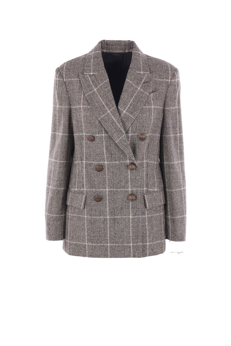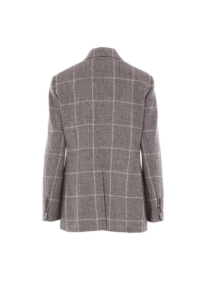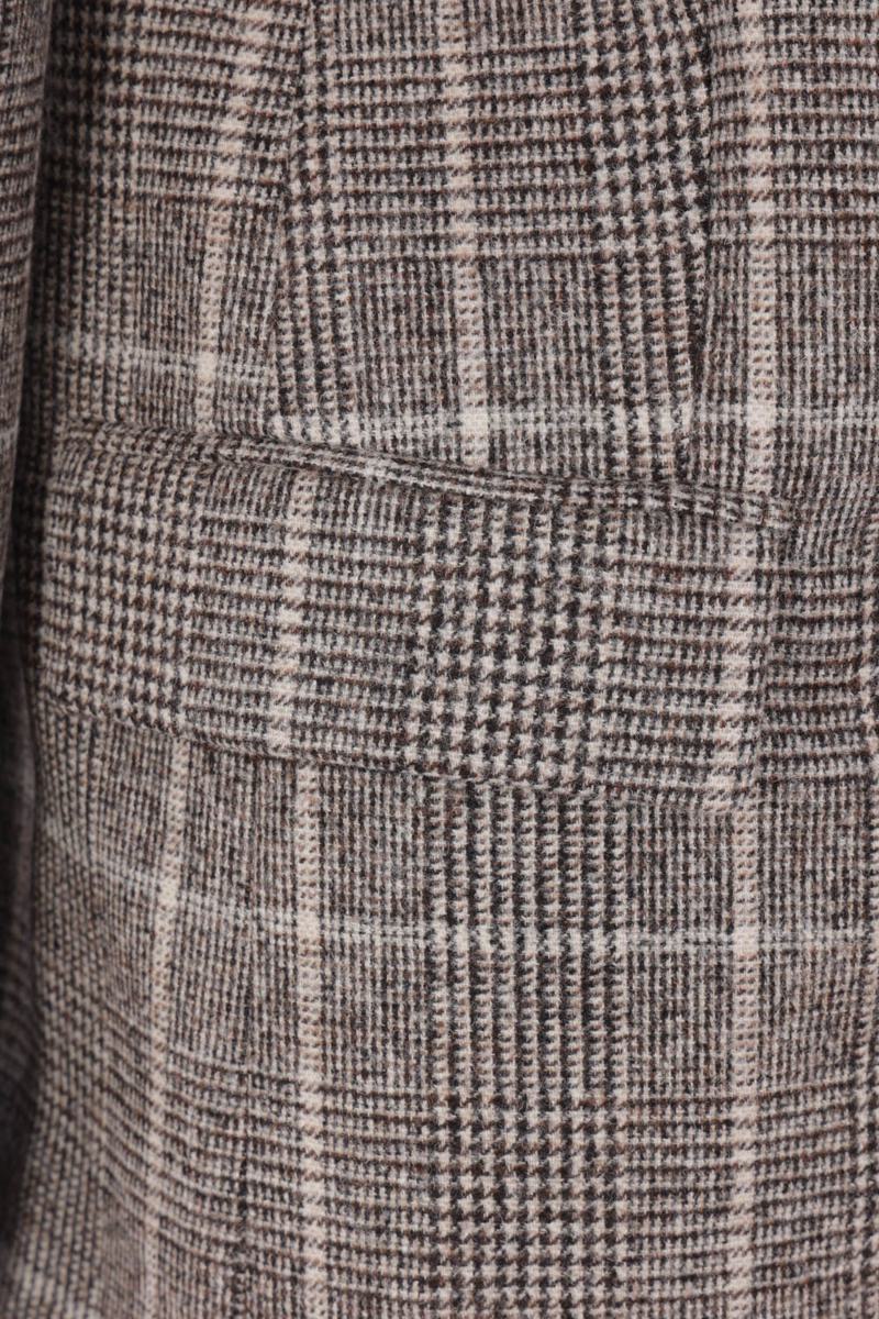 Zweireihige Jacke von Brunello Cucinelli aus brauner Wolle und Alpaka mit Prince-of-Wales-Karomuster. Mit spitzem Revers, Knopfverschluss vorne, mehreren Taschen, langen Ärmeln mit geknöpften Manschetten, einem zentralen Schlitz auf der Rückseite und vollständig gefütterter Innenseite.