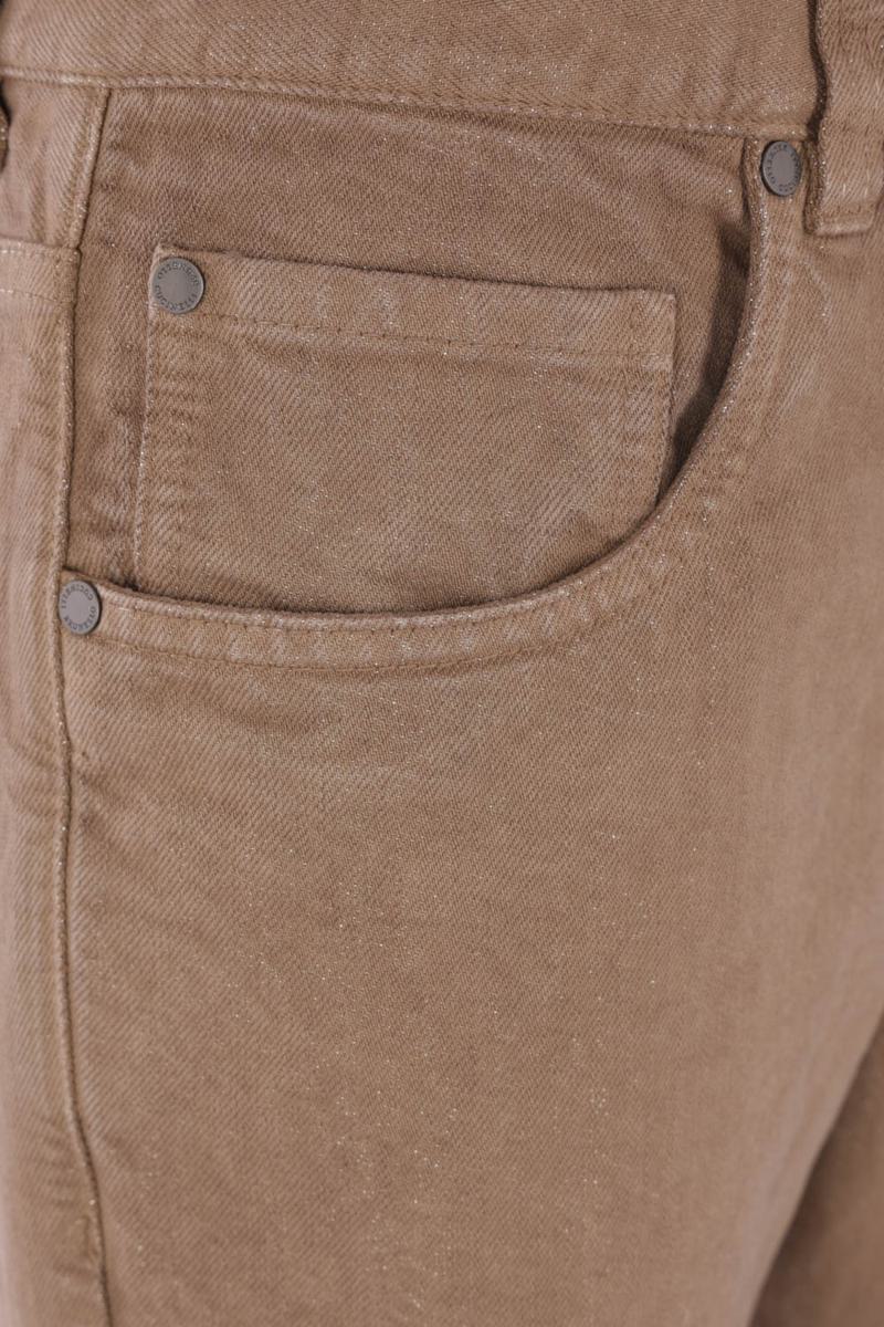 Boyfriendjeans von Brunello Cucinelli aus hellbraunem Denim und Lurex. Mit Knopf- und Reißverschluss vorne, Gürtelschlaufen, fünf klassischen Taschen und einem Logo-Patch aus Leder auf der Rückseite. Abgerundet wird das Design durch eine Schmucksteinstickerei auf der hinteren Gürtelschlaufe.