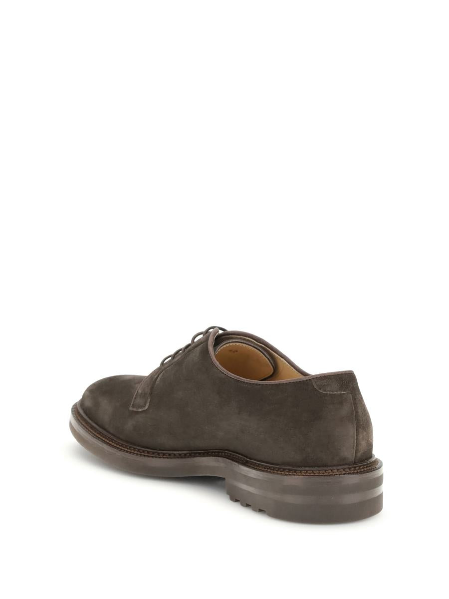 DIE LEDERSCHNÜRSCHUHE VON BRUNELLO CUCINELLI ZEICHNEN SICH AUS WEICHEM WILDLEDER, EINEM SCHNÜRVERSCHLUSS VORNE UND EINER LEDERBLOCKSOHLE. DIE KONTRASTIERENDE LOGO-EINLEGESOHLE IST EIN MARKIERTES UND RAFFINIERTES DETAIL.