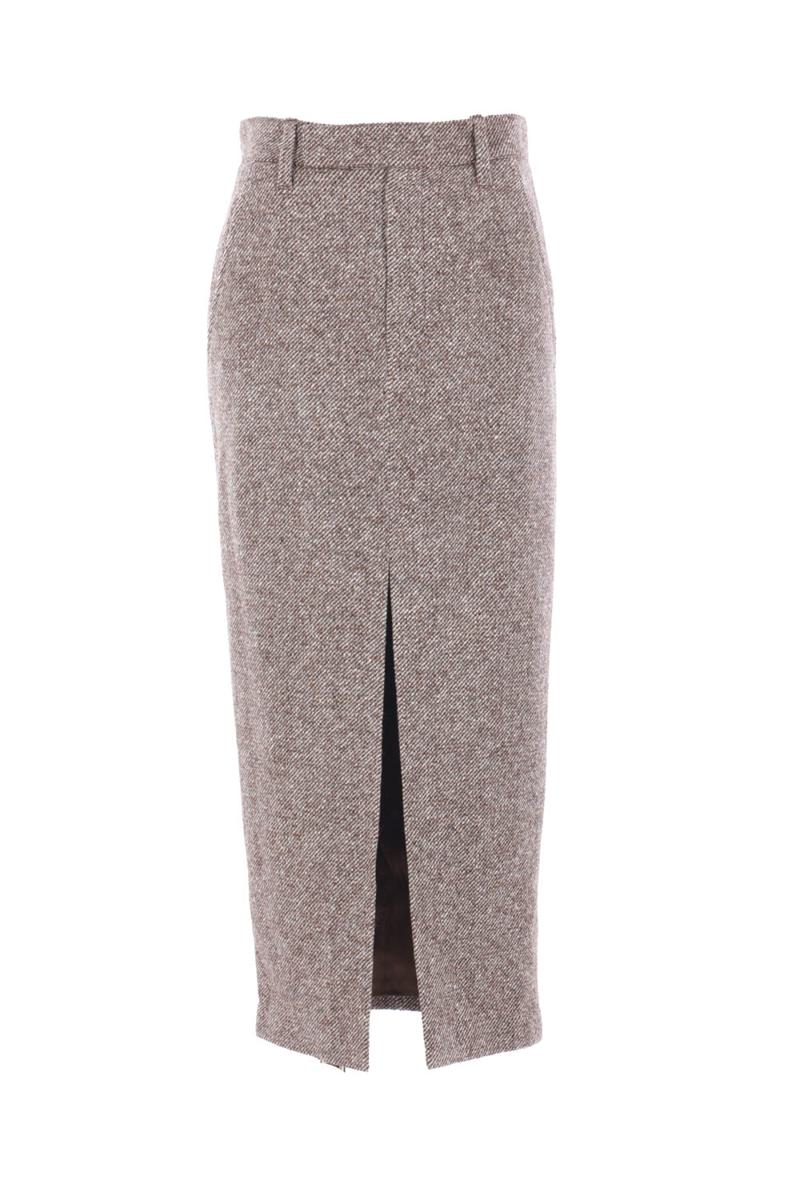 Bleistiftrock von Brunello Cucinelli aus diagonal meliertem Woll-Seiden-Mix. Mit Haken-, Knopf- und Reißverschluss vorne, Gürtelschlaufen, mehreren Taschen, einem Schlitz vorne und gefütterter Innenseite.