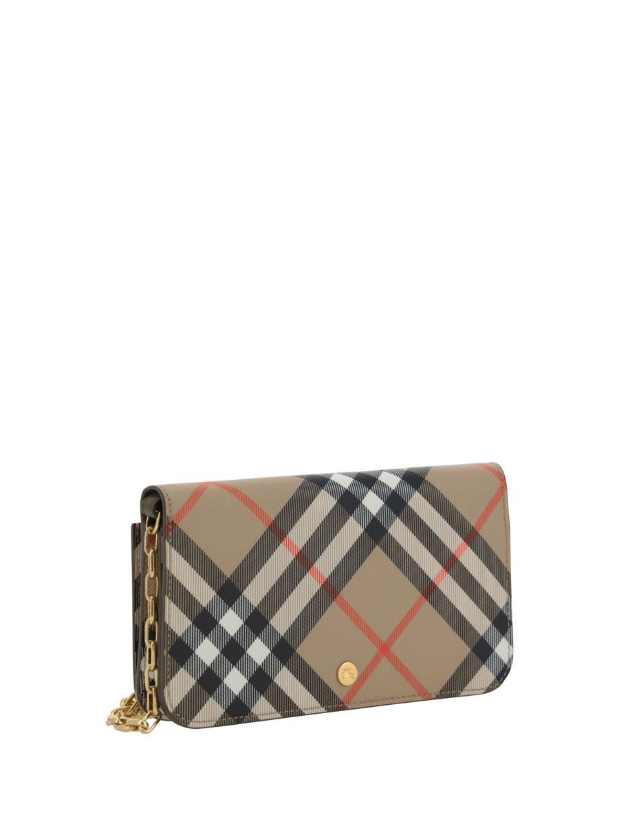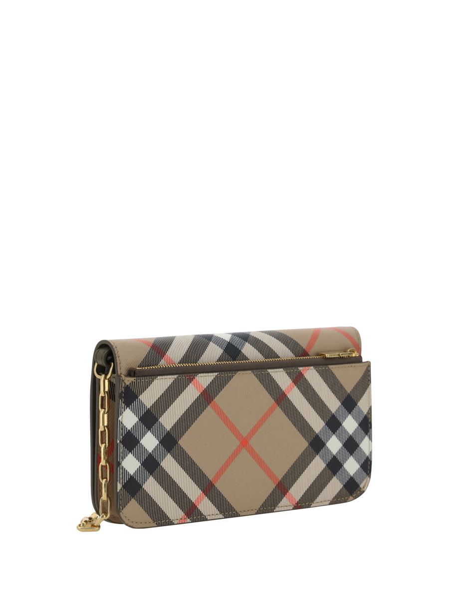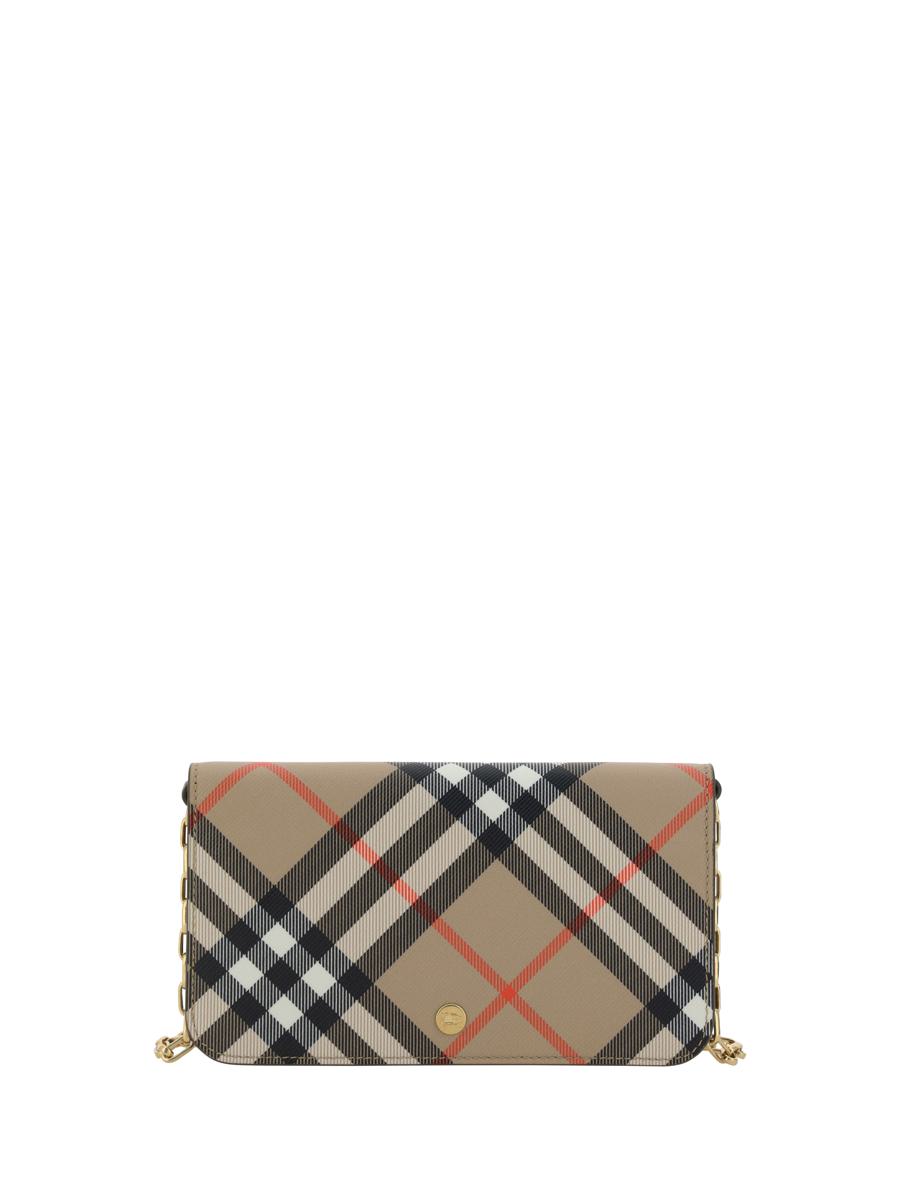 BURBERRY-GELDBÖRSE, MAGNETISCHER KLAPPVERSCHLUSS VORNE, ABNEHMBARER SCHULTERRIEMEN MIT KETTE, LEISTENTASCHE MIT REISSVERSCHLUSS AUF DER RÜCKSEITE, KARTENFÄCHER INNEN, VOLLSTÄNDIG WIEDERHOLTES MARKEN-CHECK-ARCHIVMUSTER.