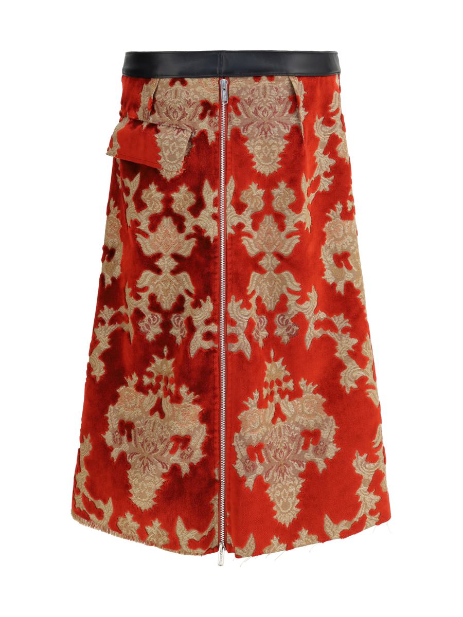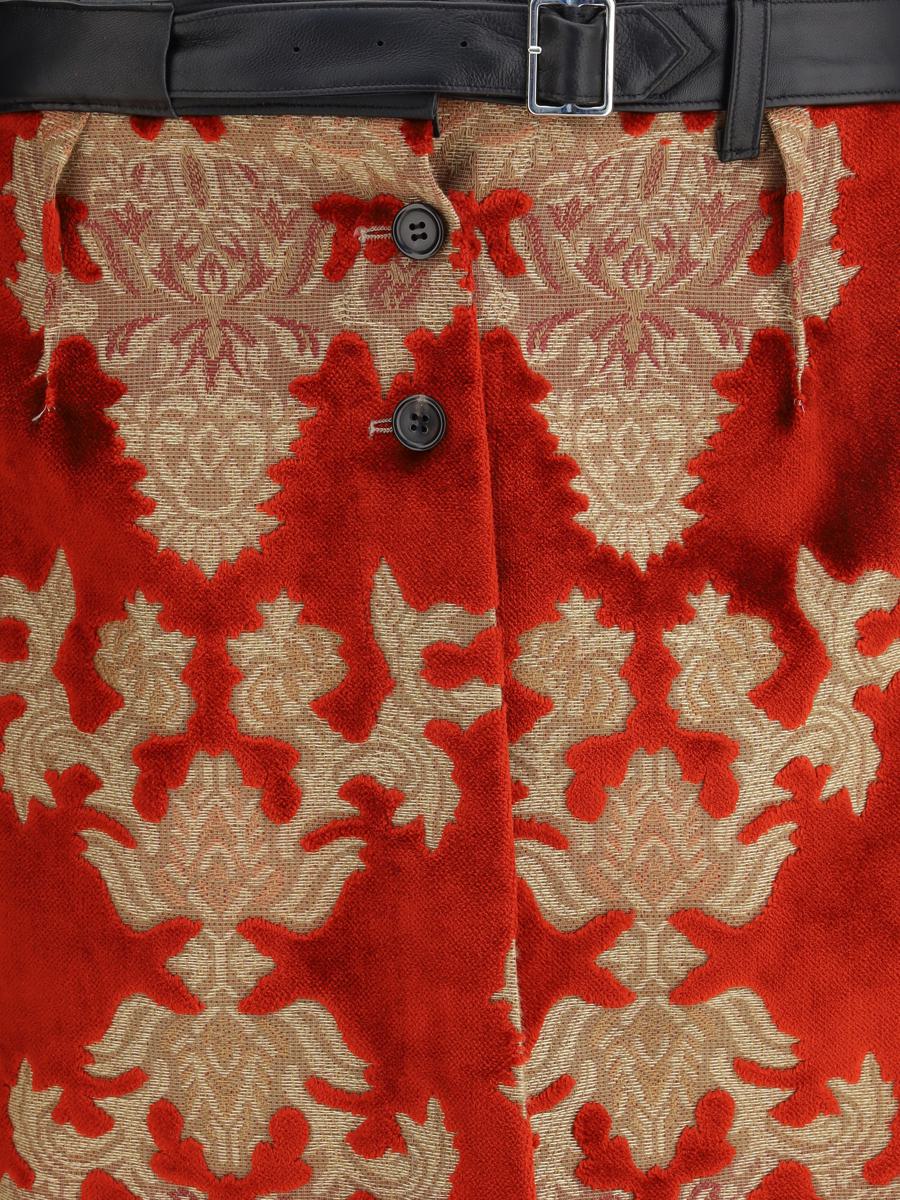 DER BROKAT-MIDIROCK VON UNDERCOVER VERBINDET KLASSISCHE ELEGANZ UND EXPERIMENTELLES DESIGN IM ECHTEN STIL DER JAPANISCHEN MARKE. ER IST AUS RAFFINIERTEM BROKATSTOFF GEFERTIGT UND VERFÜGT ÜBER EINEN SEITLICHEN REISSVERSCHLUSS, DER SICH ÜBER DIE GESAMTE LÄNGE DES PANELS ANWENDEN LÄSST, SO DASS SIE ÖFFNUNG UND SCHLITT INDIVIDUELL GESTALTEN KÖNNEN. DER VERSCHLUSS WIRD DURCH ZWEI KNÖPFE UND SEITLICHE HAKEN ZUM PRÄZISE EINSTELLEN DES SCHLITTS ABGESCHLOSSEN. DIE RÜCKSEITE BEFINDET SICH IN DER MITTE EINES SCHLITTS UND EINER SCHLITTTASCHE MIT KLAPPE, WÄHREND DER LEDERBUND MIT VERSTELLBAREM GÜRTEL UND METALLSCHNALLE EINE STRUKTURIERTE UND MODERNE NOTE VERLEIHT. EIN STATEMENT-PIECE, PERFEKT FÜR RAFFEINERE LOOKS MIT KONZEPTIONELLER SEELE.