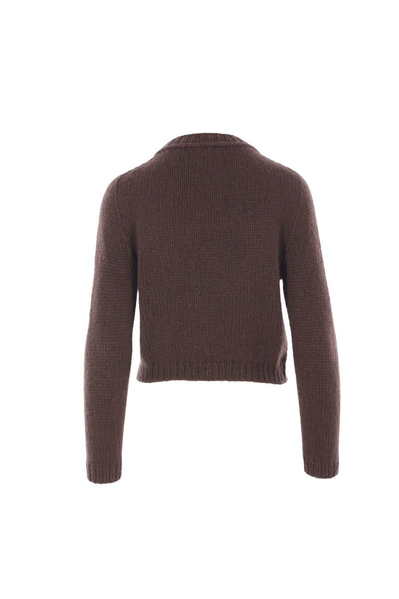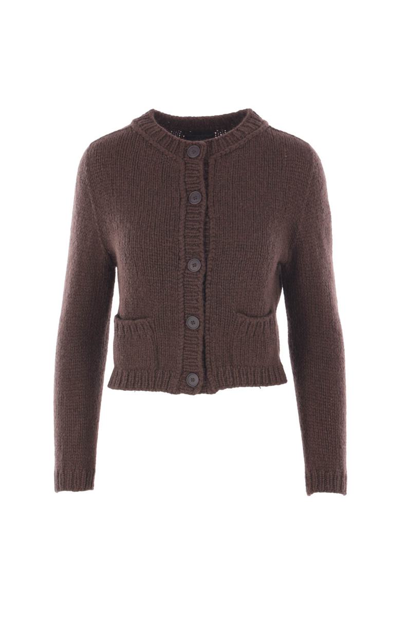Handgefertigte Strickjacke von Wommelsdorff aus braunem Kaschmirstrick. Mit Rundhalsausschnitt, Knopfverschluss, aufgesetzten Vordertaschen, langen Ärmeln und gerippten Abschlüssen.