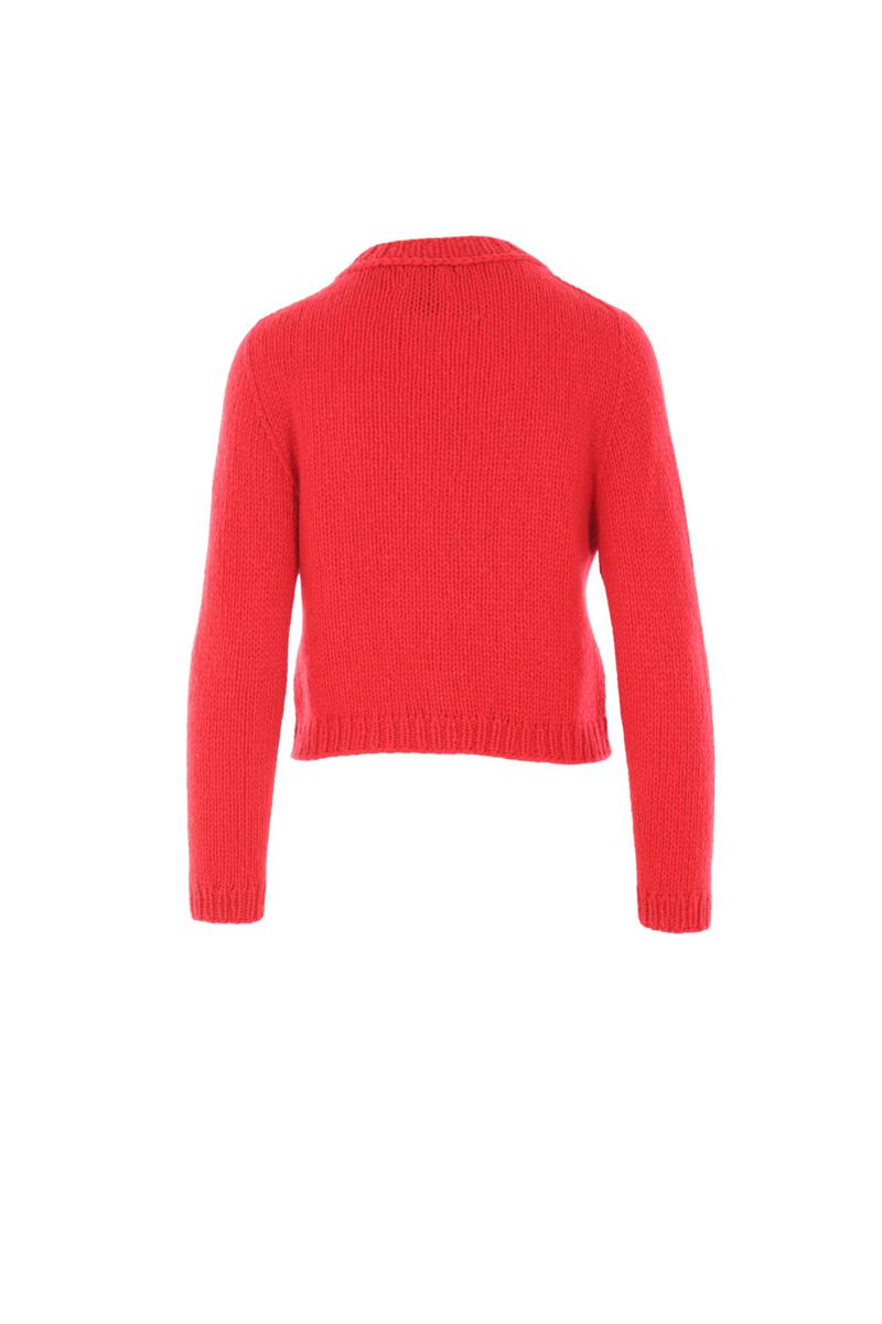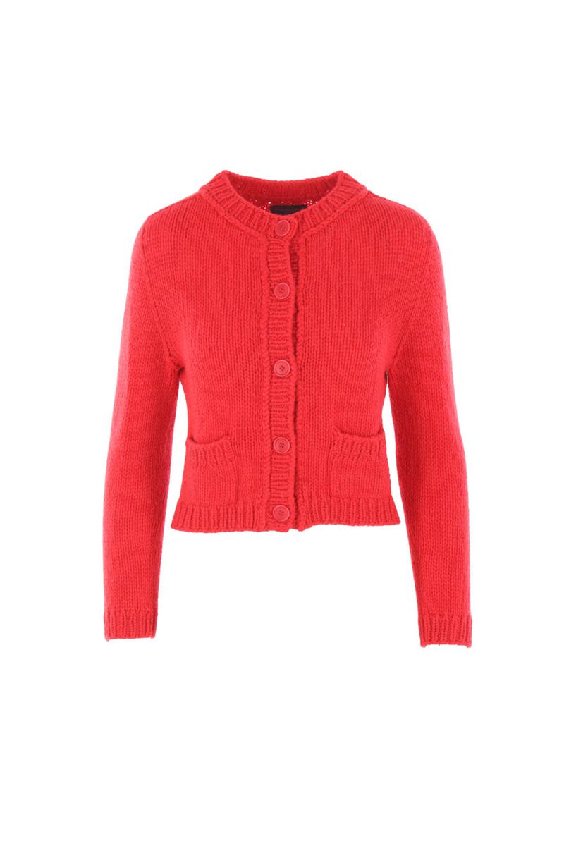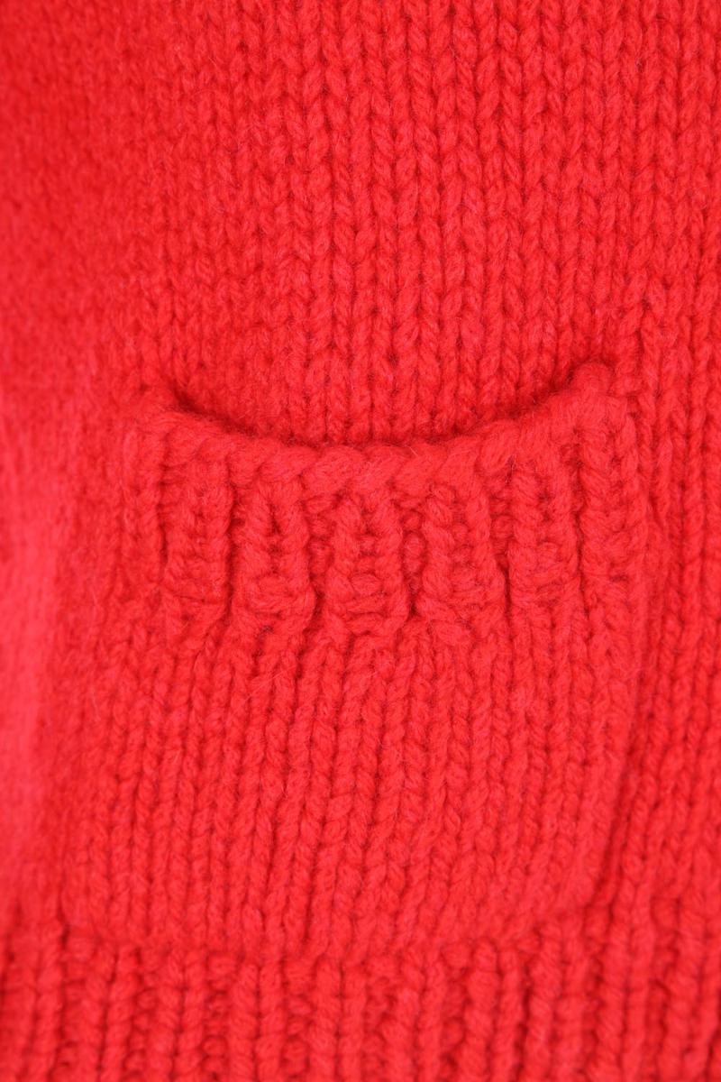 Handgefertigte Strickjacke von Wommelsdorff aus rotem Kaschmirstrick. Mit Rundhalsausschnitt, Knopfverschluss, aufgesetzten Vordertaschen, langen Ärmeln und gerippten Abschlüssen.
