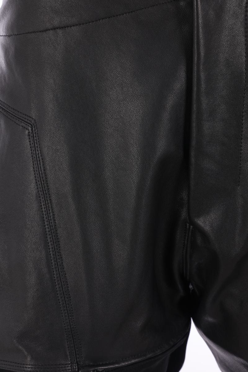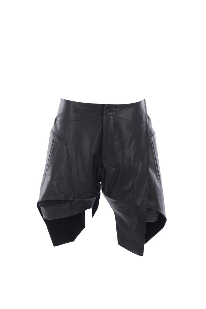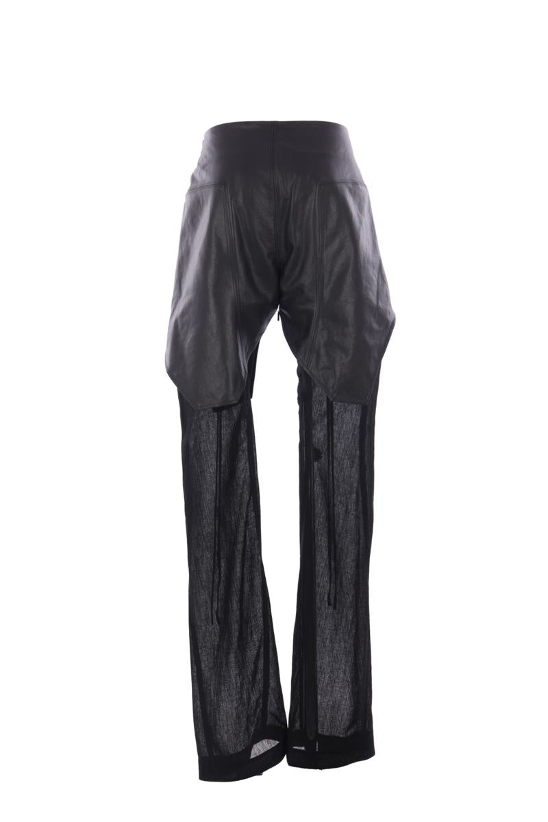 Yehuafan-Hose aus schwarzem Leder mit abnehmbaren, halbtransparenten Canvas-Beinteilen und austauschbaren Einsätzen im Leggings-Look. Mit Knopf- und Reißverschluss vorne, seitlichen Leistentaschen und asymmetrischem Design. Innen gefüttert.